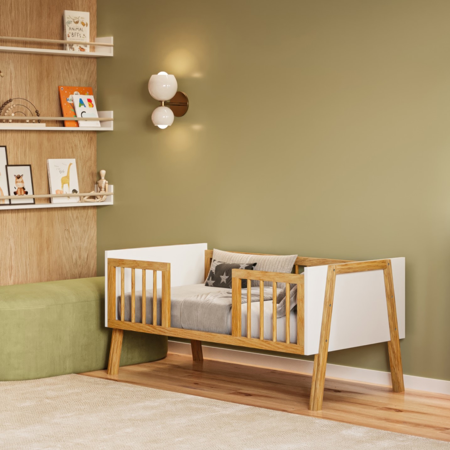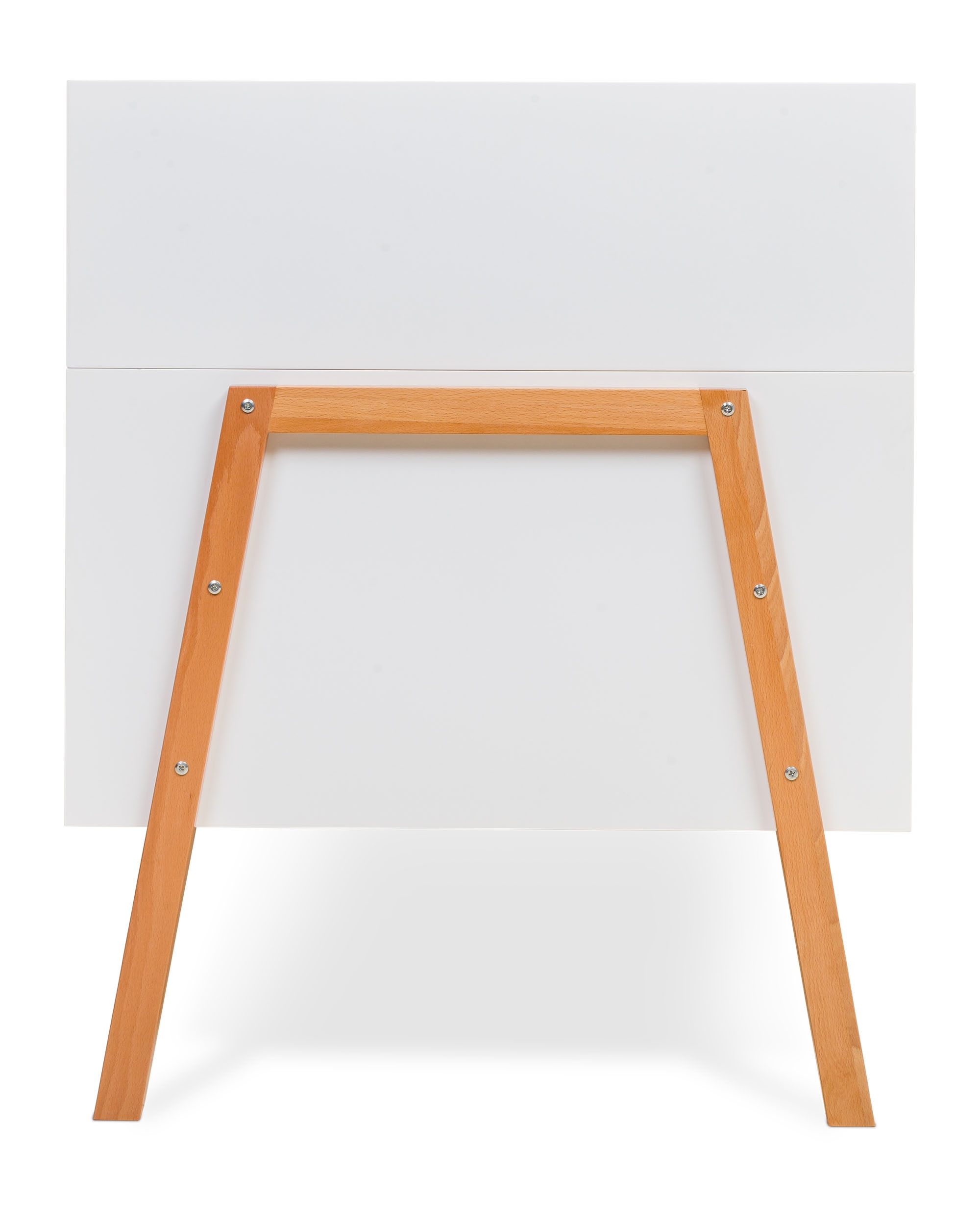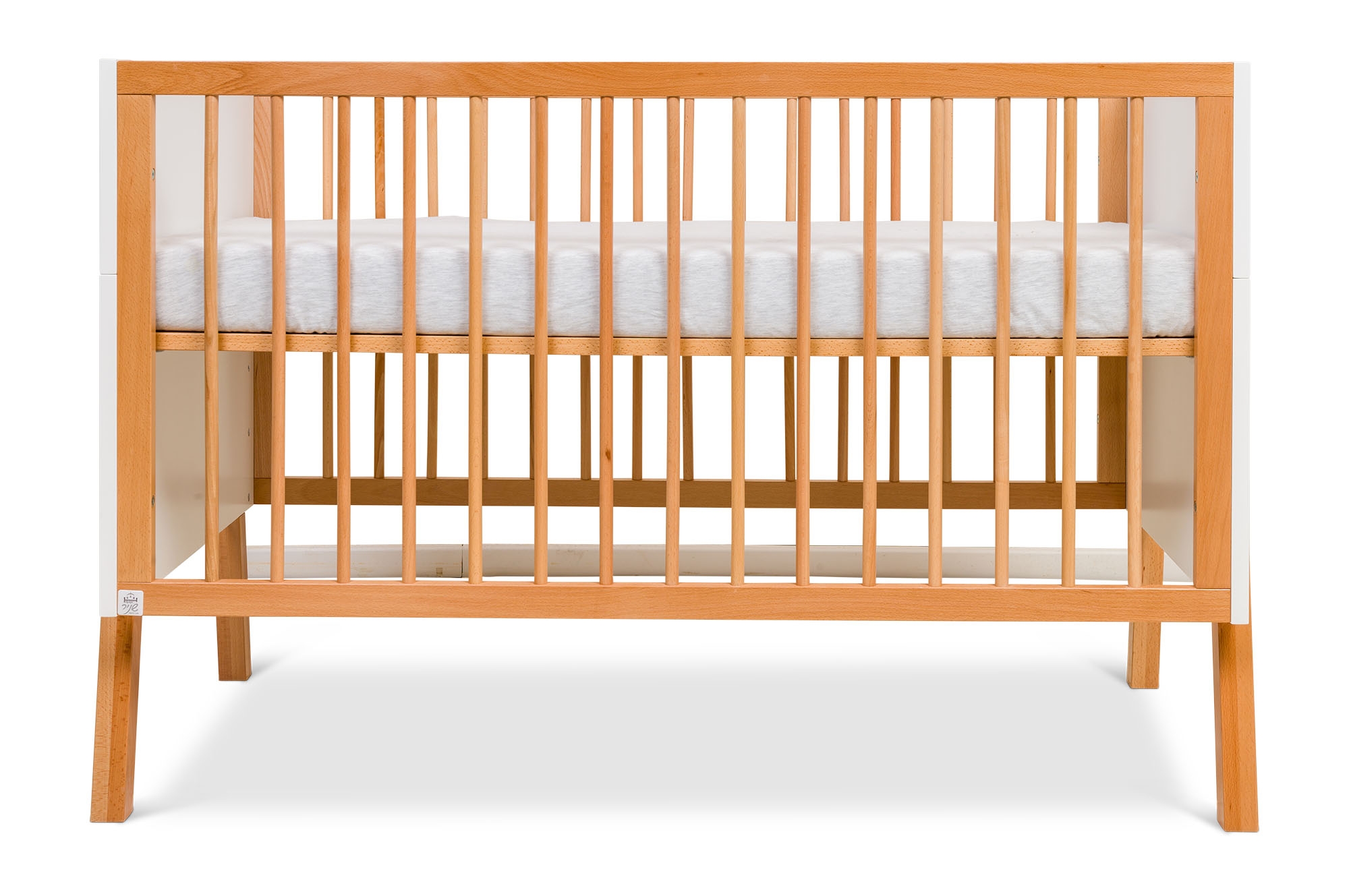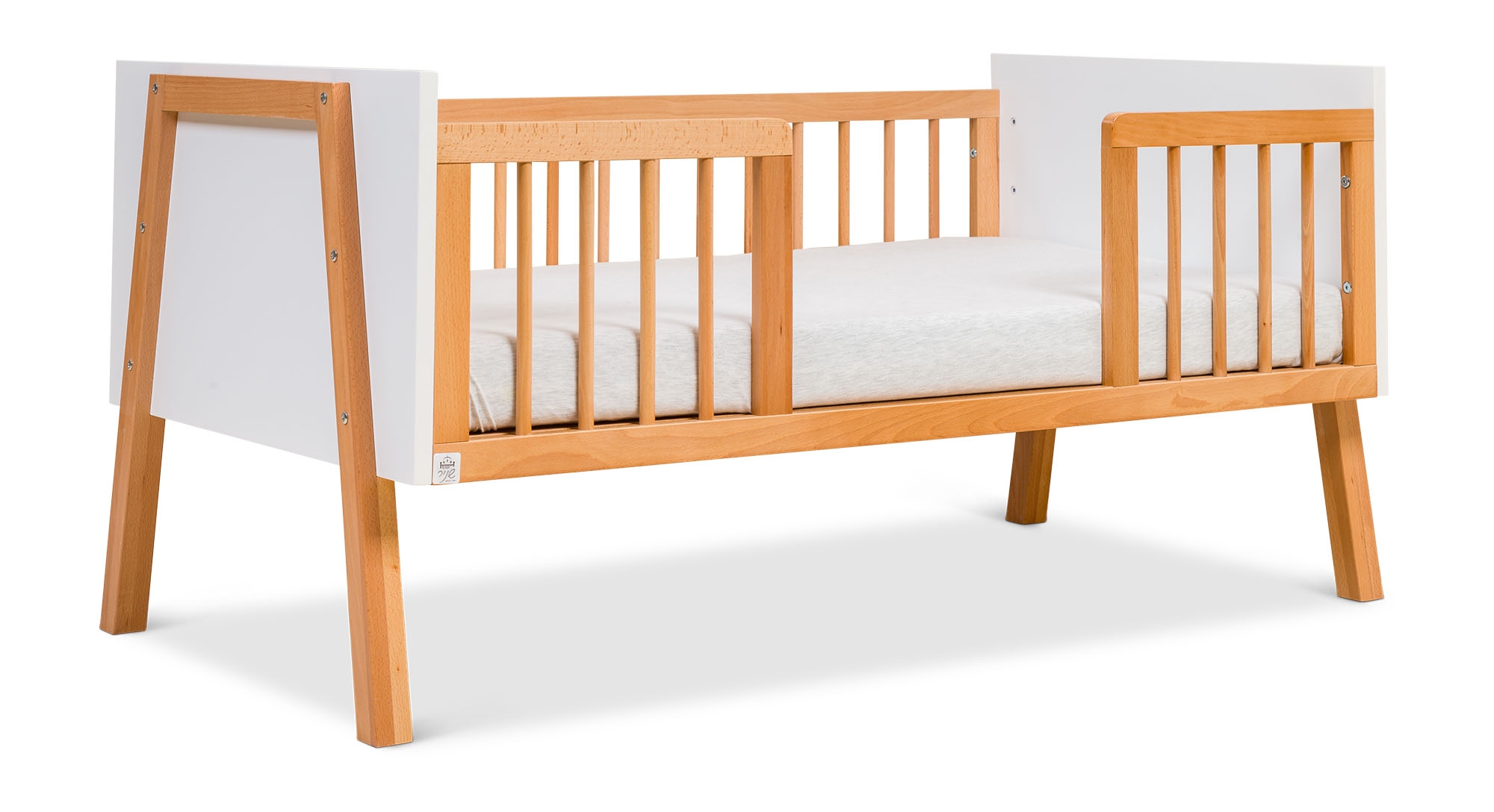 2-in-1 solid beech wood baby bed + transition. The bed comes with transition ladders and can be easily and simply converted, with beech wood that matches a wide range of dressers. The bed has stylish beech wood legs that raise it and give it an impressive and dominant look.