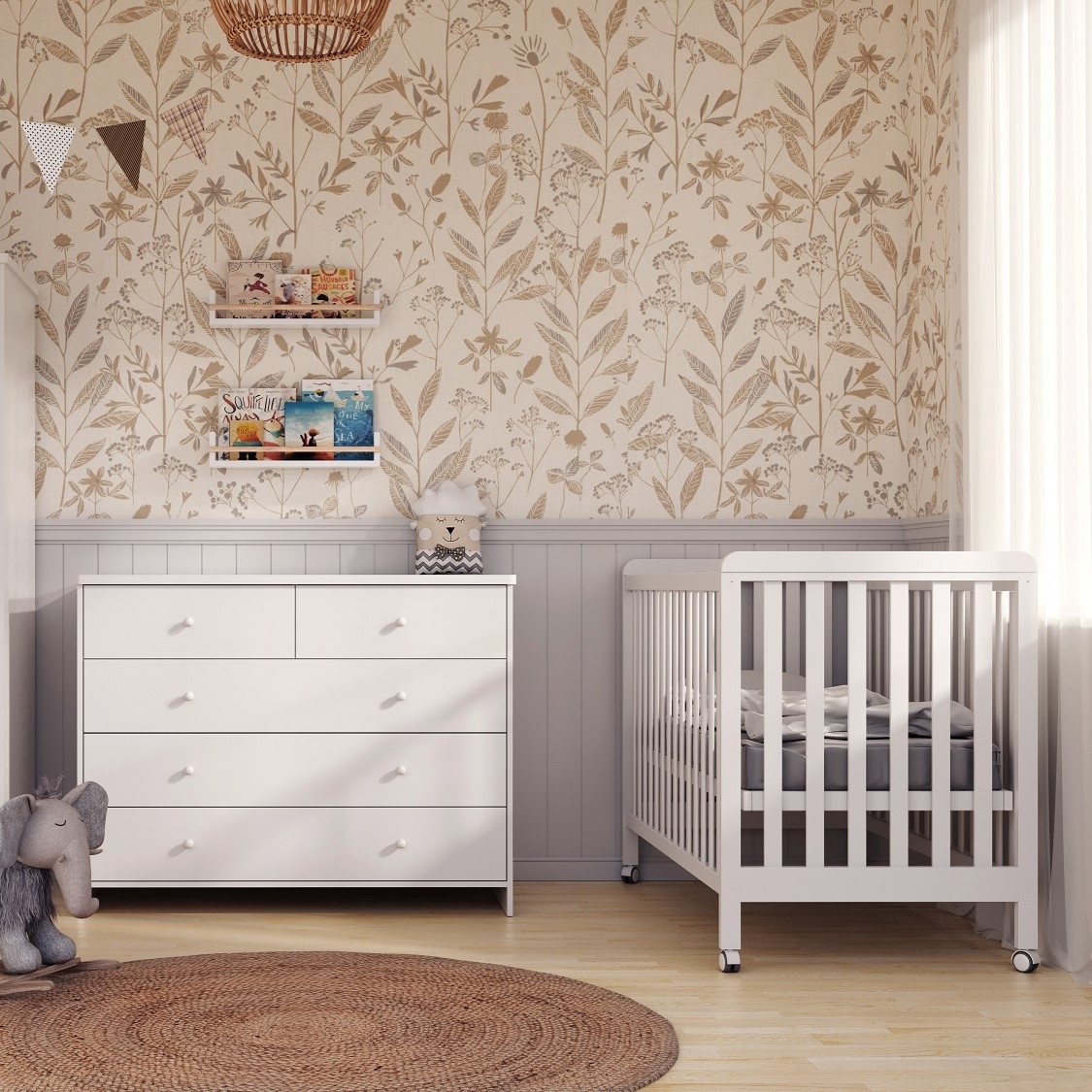 שידת בייסיק- מסילות גלגל לבנות. צבע: לבן חומר גלם: MDF שילוב סיבית ציפוי מלמין טקסטורה חלקה. פרטים נוספים: פלטה עליונה עבה 25 מ"מ עם פינות מעוגלות לבטיחות התינוק